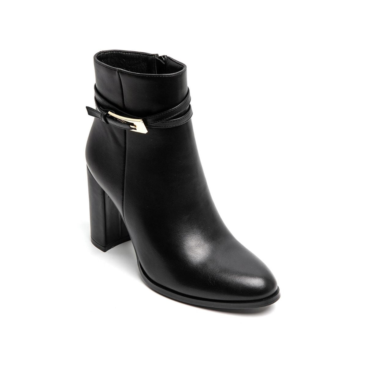 Bottines à talons en cuir synthétique couleur noir avec boucle en gold.